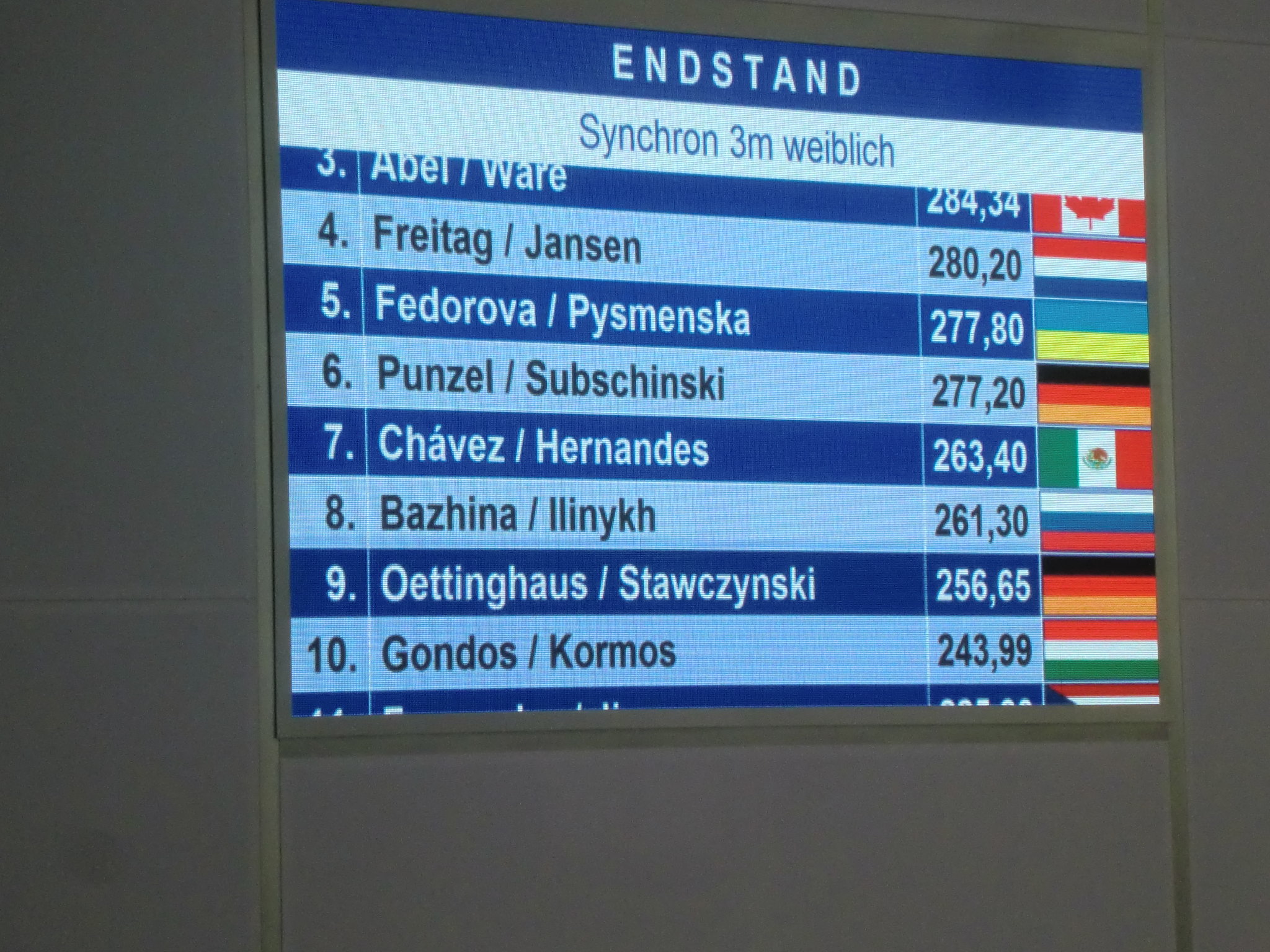 In den beiden anderen Wettkämpfen des Abschlusstages hatten Sportler aus China und Canada gewonnen. Die Canadierinnen Meaghan Benfeito & Roseline Filion setzten sich im Turm Snchron mit nur einem Punkt Vorsprung gegen die erst 13-jährigen Asiatinnen durch. Platz drei ging nach Mexiko. Das deutsche Paar Tina Punzel/ Christina Wassen landete auf Platz fünf.
