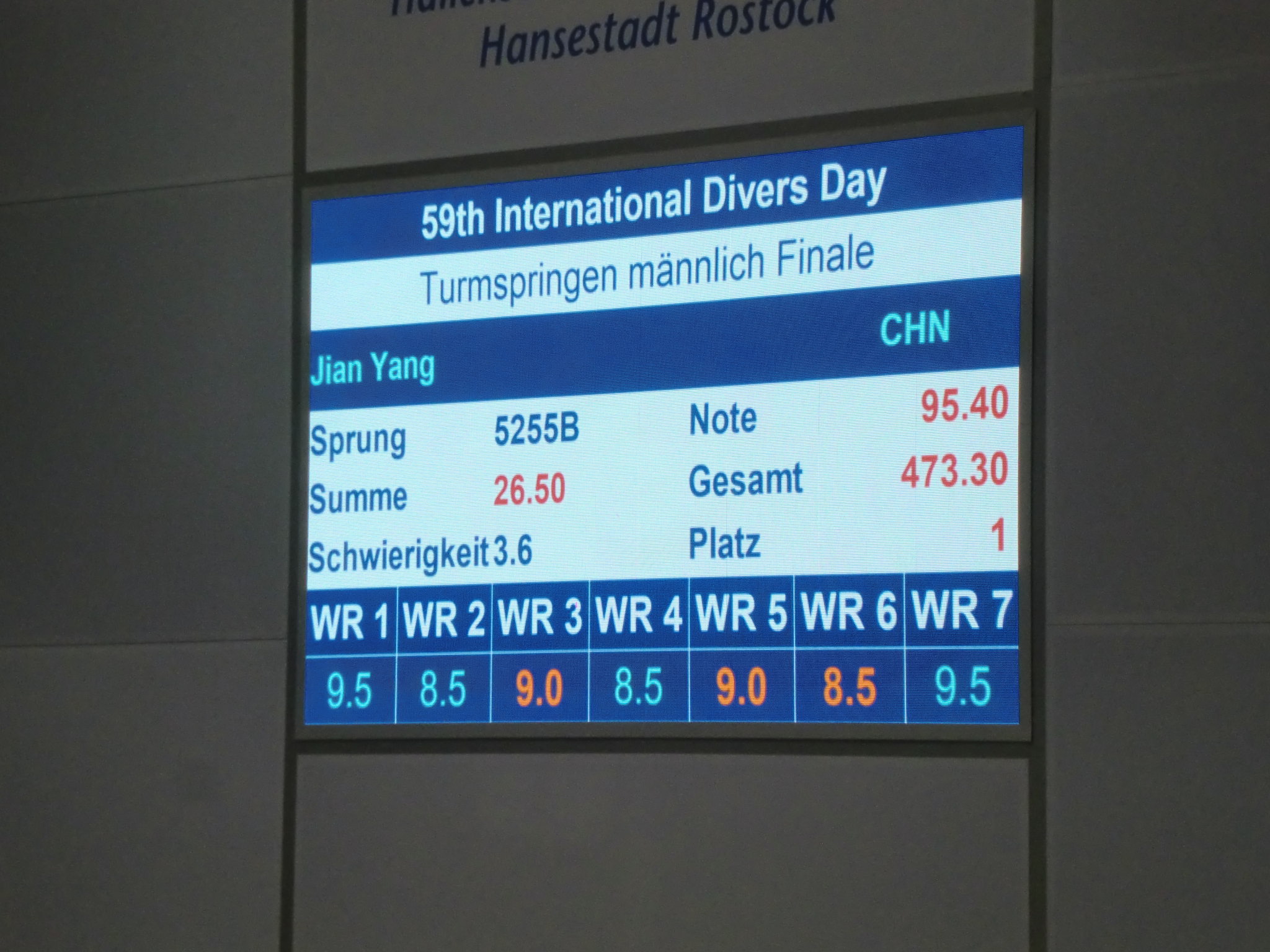Der Sieg ging an das chinesische Synchronpaar. Im vorletzten Durchgang übernahmen sie die Führung und verwiesen das deutsche Duo Patrick Hausding/ Stephan Feck auf den silbernen Platz.