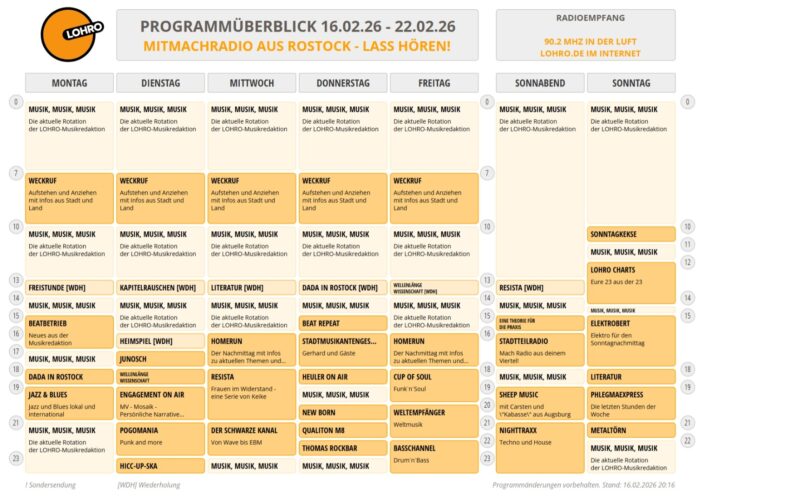 LOHROs Wochenprogramm in großer Vielfalt. Wer alle Sendung der Woche sehen will –  der schaut aufs Bild und wenn das nicht weiterhilft –  dann in die Tagesansicht – da halten wir auch kurzfristige Änderungen fest.