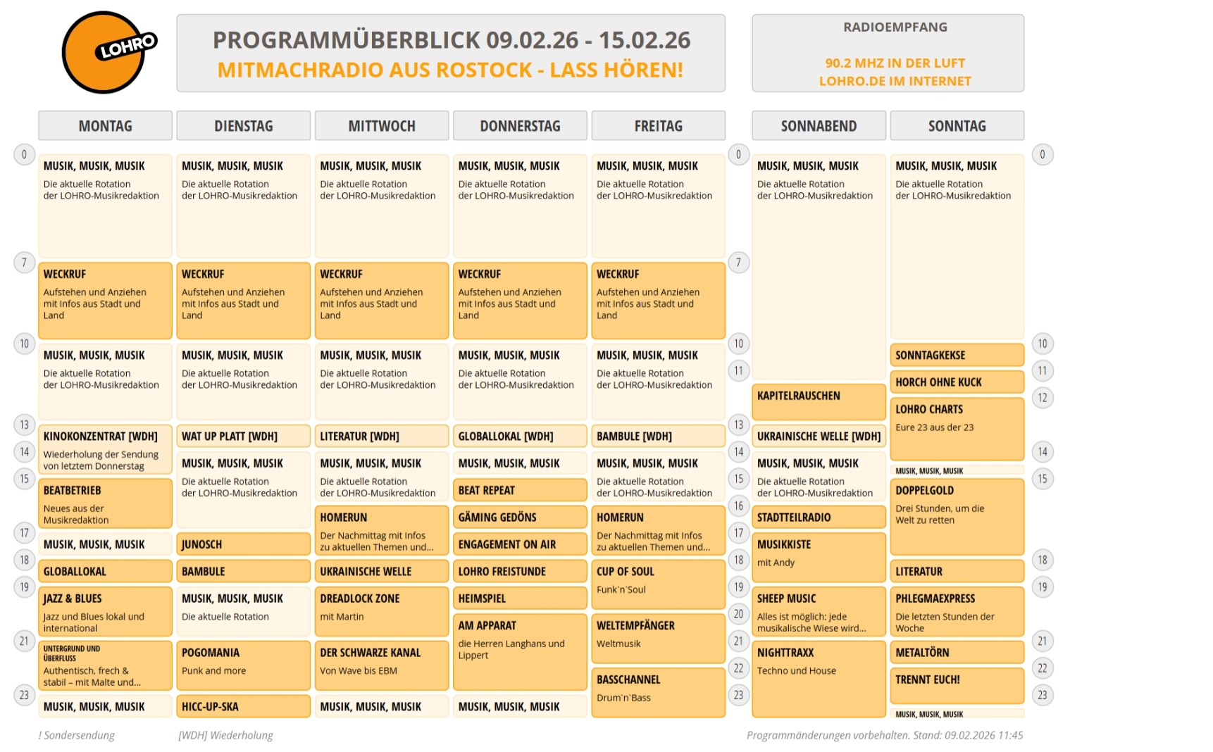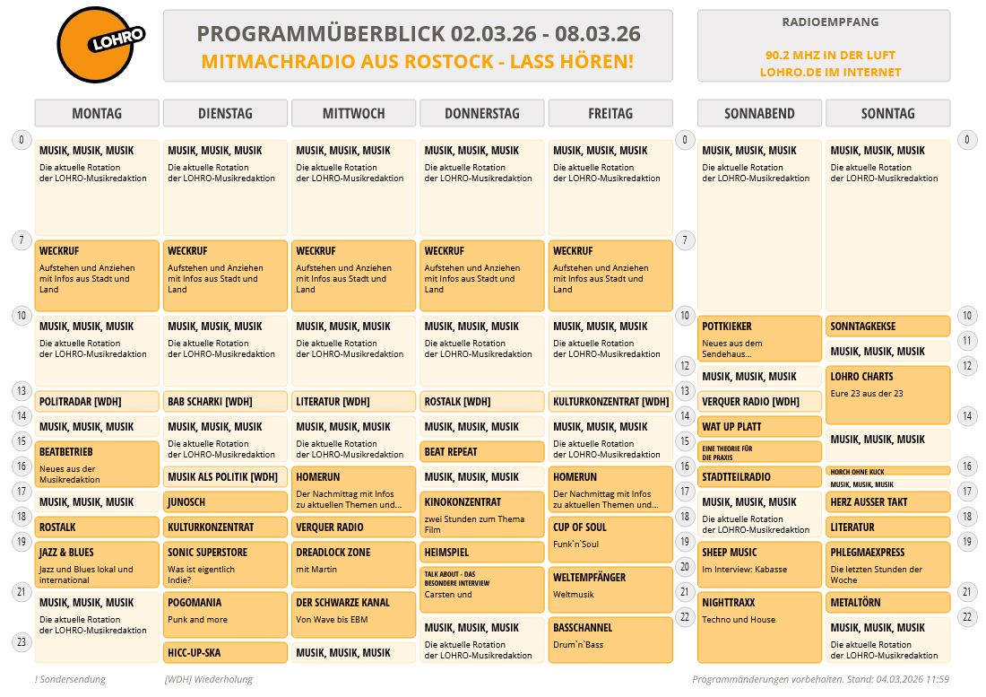 LOHROs Wochenprogramm in großer Vielfalt. Wer alle Sendung der Woche sehen will – der schaut aufs Bild und wenn das nicht weiterhilft – dann in die Tagesansicht – da halten wir auch kurzfristige Änderungen fest.