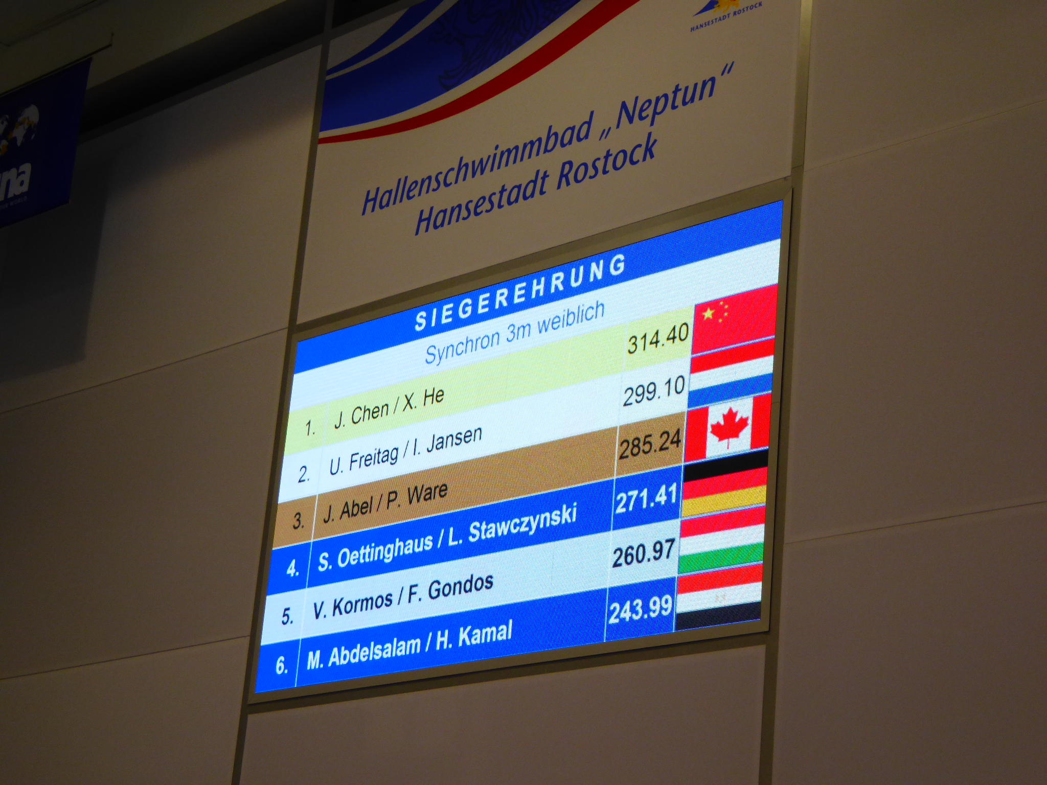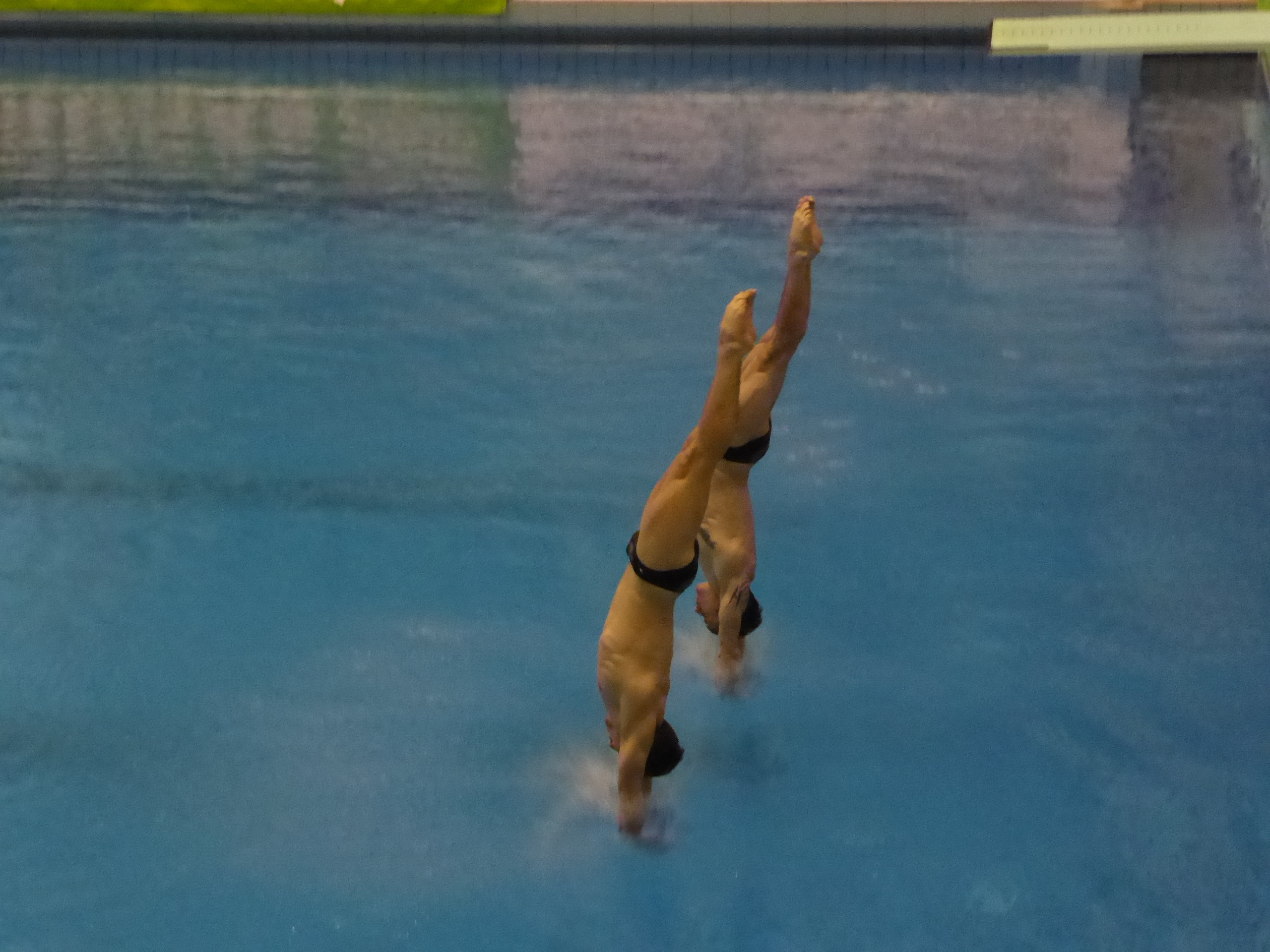 Die Rostockerin Saskia Oettinghaus (17 Jahre/Bild unten links) war beim 61. Internationalen Springertag im Synchron vom 3m-Brett nominiert. Mit ihrer Dresdner Partnerin Louisa Stawczynski (18) brachte sie das viertschwerste Programm ins Finale – am Ende wurde es hinter den Duo’s aus China, den Niederlanden und Kanada – auch der vierte Platz. Da die Konkurrenz schwächelte wäre durchaus mehr drin gewesen für die deutschen Youngster. Leider kamen aber auch Saskia & Louisa nicht ohne Fehler aus. Trainer Michail Sachiasvili war dennoch zufrieden: „Wir haben das Programm ein wenig schwerer gemacht – sie sind noch beim lernen.“