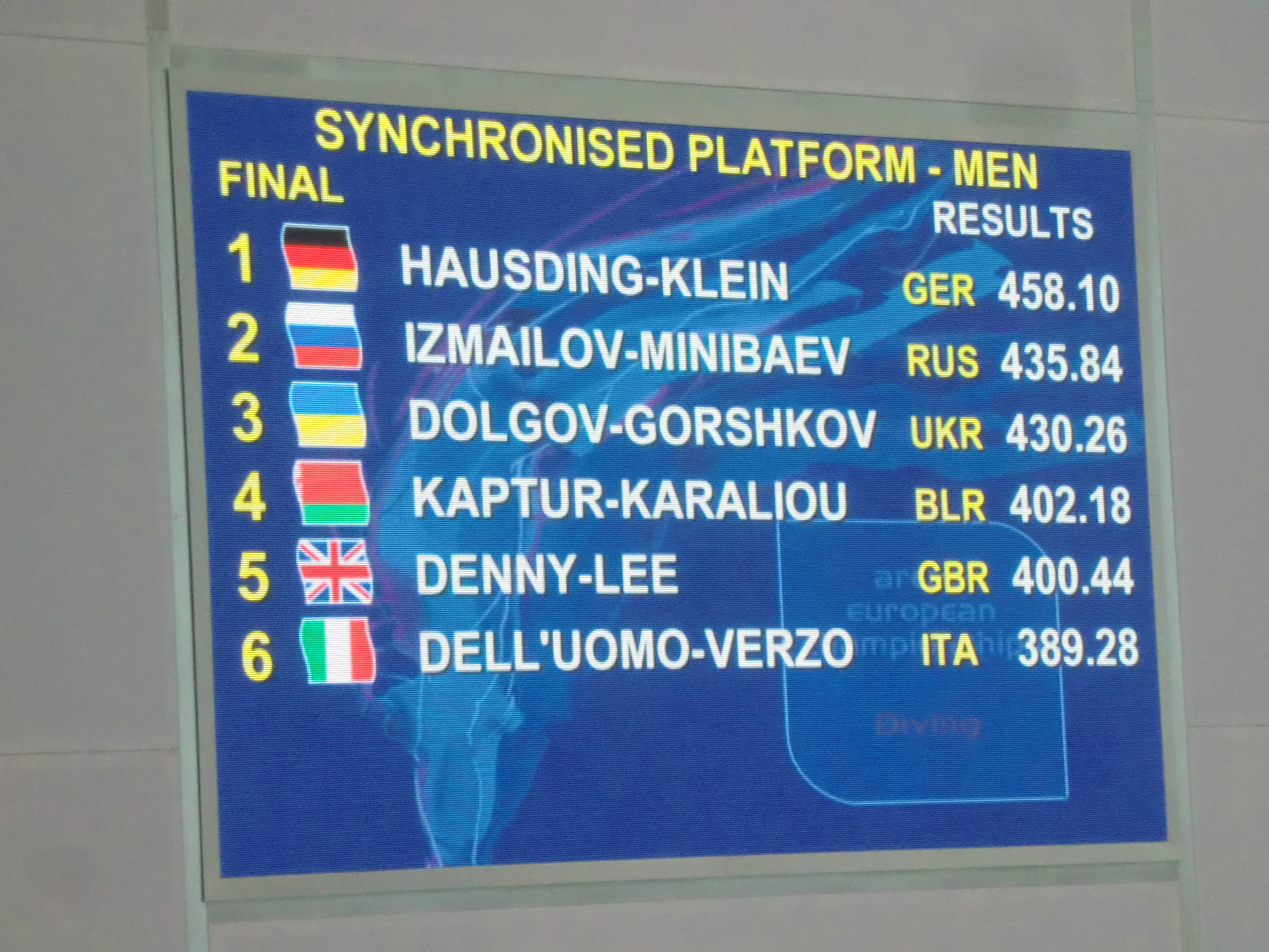 Das deutsche Erfolgspaar Hausding/ Klein ist nunmehr seit ihrem EM-Titel im Jahr 2008 ungeschlagen bei kontinentalen Titelkämpfen. Auf den Plätzen folgten die Synchronpaare aus Russland und der Ukraine.